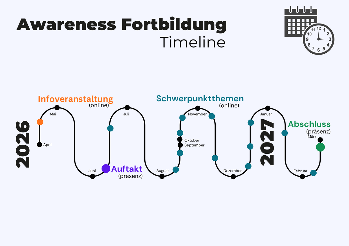 Zeitraum: Auftakt- und Abschlussveranstaltung finden in Präsenz in Hannover statt. Zwischen diesen finden monatlich Schwerpunktveranstaltungen unter der Woche von 17-20 Uhr online statt. Die gesamte Fortbildung läuft somit von Juni 2026 bis März 2027 und umfasst insgesamt 29 - 41 Zeitstunden. Der Umfang hängt davon ab, wieviele Schwerpunktveranstaltungen besucht werden. Es werden keine Veranstaltungen in den Ferien liegen.