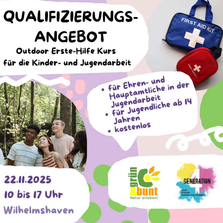 Notfälle im Freien stellen pädagogische Fachkräfte und jugendliche Teamer*innen vor besondere Herausforderungen. Gemeinsam mit grün&bunt gUG aus Wilhelmshaven veranstaltet das Förderprogramm 4Generation deshalb den Outdoor Erste-Hilfe-Kurs für die Kinder und Jugendarbeit.